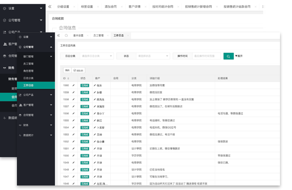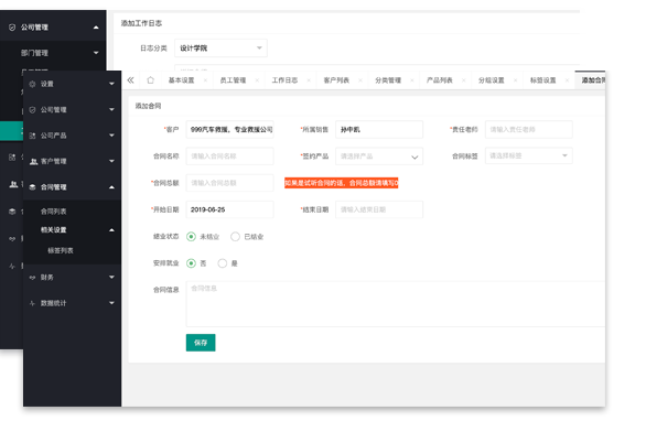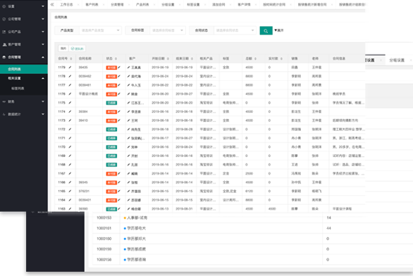 提供统一集中的围绕着人和事的多角度统计分析和报表数据。客户统计,合同统计,财务统计等多方面的报表
